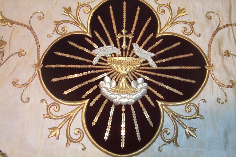 Motif central : colombes s'abreuvant au caliceImmatriculation