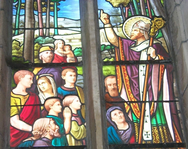 Ensemble des 3 verrières à personnages des baies 0 à 2 : Couronnement de la Vierge, Prédication et mort de saint Melaine,