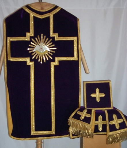 Ornement violet : chasuble, bourse de corporal, étole, manipule, voile de calice,