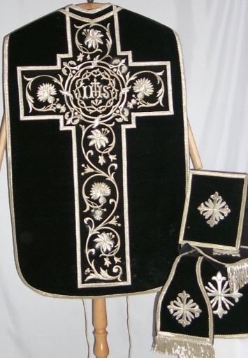 Ornement noir : chasuble, bourse de corporal, étole, manipule, voile de calice,