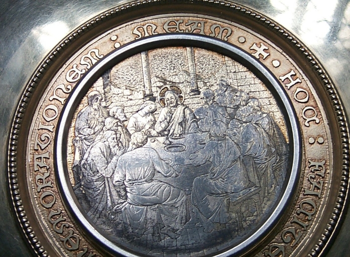 Chapelle et sa boîte : calice, patène, 2 burettes et leur plateau, clochette,