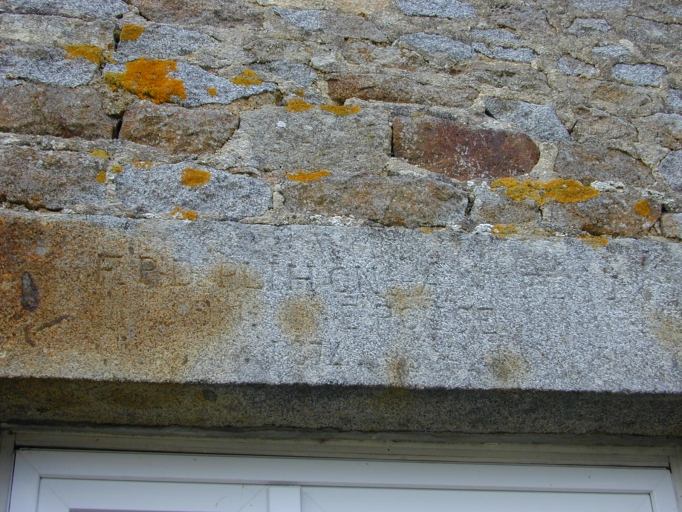 Façade antérieure, porte de la salle, linteau gravé d'inscriptions : détailImmatriculation