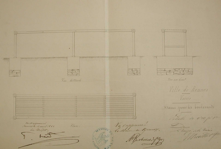 Plan, coupe et profil des bancs à placer sur les boulevards, par Boullet, 1864 (A. C. Rennes)Immatriculation