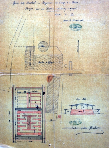 Projet pour une tuilerie système Bürher au moulin d'Apigné, plan au sol et coupe transversale (23 août 1906).Immatriculation