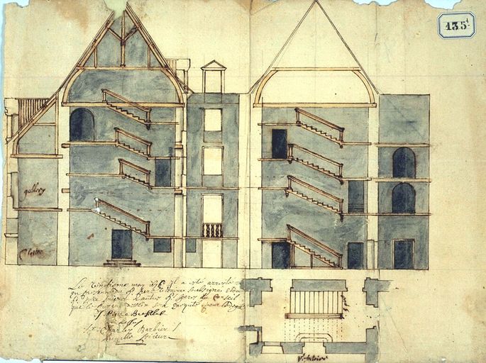 Plan du couvent des dominicains : coupe, par François Cosnier, 20 mai 1676. AD Morbihan 1Fi 135/1.Immatriculation