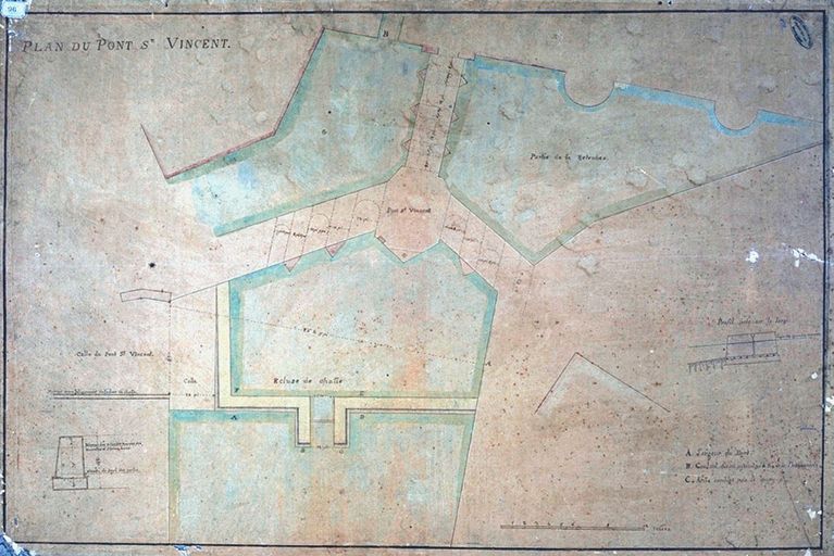 Plan du pont Saint-Vincent à Vannes. Dessin : plan, 18e siècle. AD Morbihan 1 Fi 96.Immatriculation