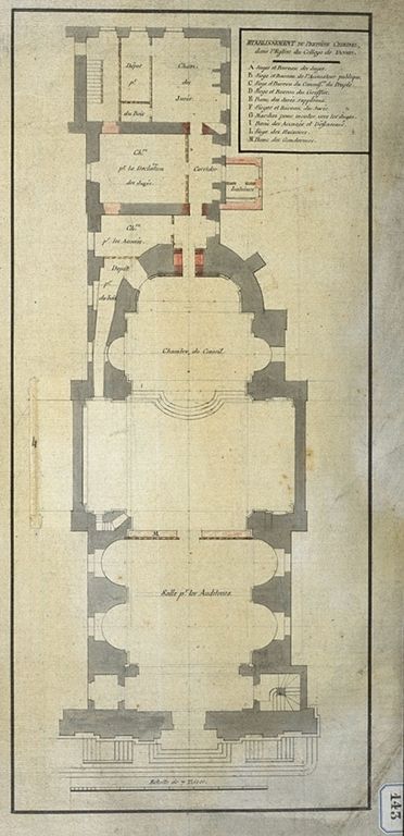 Plan du rétablissement du prétoire criminel dans l'église du collège, 1792. AD Morbihan 1Fi 143.Immatriculation
