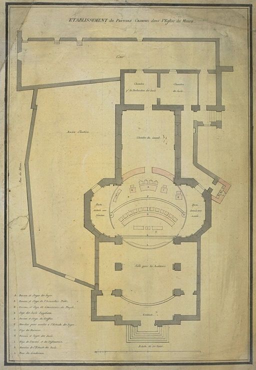 Plan de l'établissement du prétoire criminel dans l'église du Menez, 1791. AD Morbihan 1Fi 144.Immatriculation