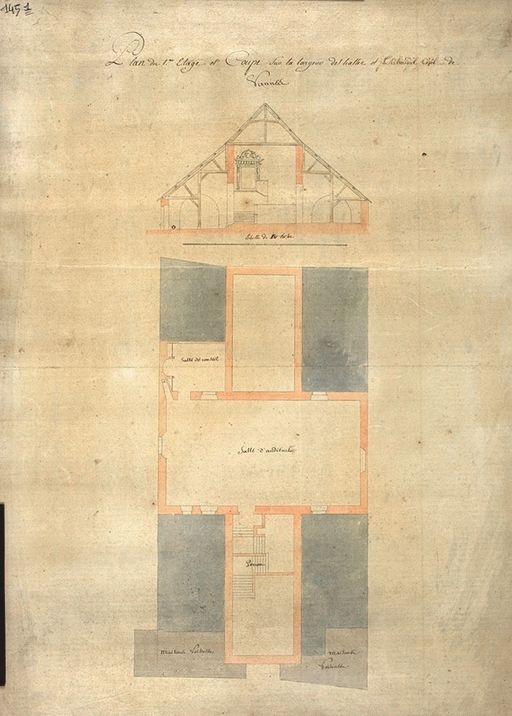 Plan du premier étage et coupe sur la largeur des halles, fin 18e siècle. AD Morbihan 1 Fi 145/1.Immatriculation