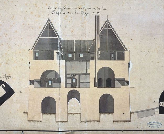 Plans et coupe et élévations des tours du Bourreau, de la Pistole et de la Geole : détail, par Brunet-Debaines, 1811. AD Morbihan 1Fi 205.Immatriculation