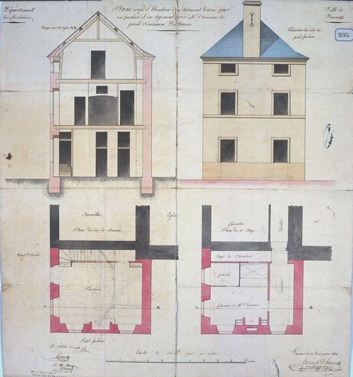 Plan, coupe, élévation pour un bâtiment du grand séminaire diocésain par Brunet-Debaines, 1836. AD Morbihan 1Fi 295.Immatriculation