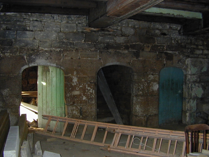 Rez-de-chaussée, pièce principale, mur nord, portes d'accès à l'escalier et au cellier nord.Immatriculation
