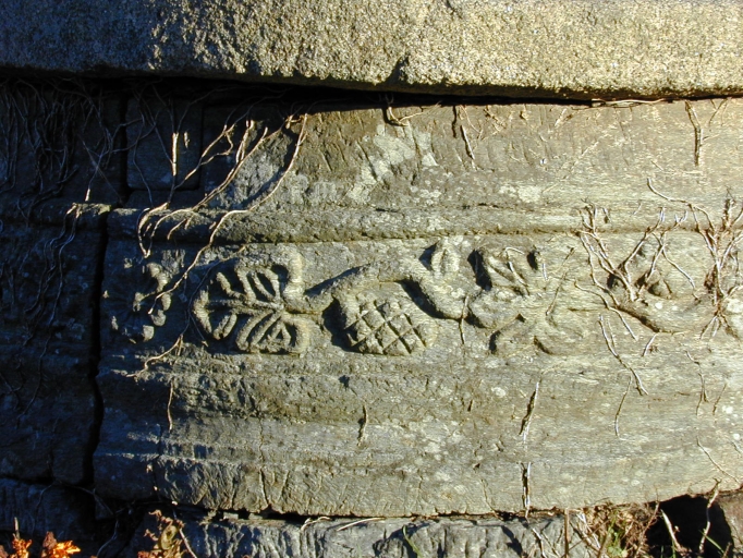 Kerguh, puits en schiste (18e siècle ?) daté 1865 : détail de la base sculptée.Immatriculation