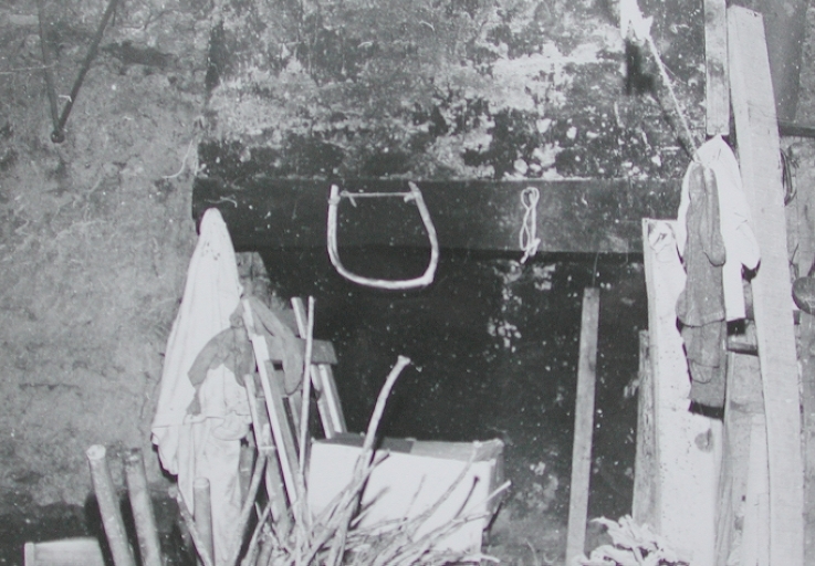 Cheminée à linteau de bois et hotte recouverte de torchis de la forge (cliché Inventaire, 1976).Immatriculation