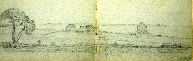 Le Pouldu en 1891, avec l'Hôtel des Dunes à gauche et la ville Castel Tréaz à droite. Dessin au crayon de Charles de La Poix de Fréminville, 1856-1936 (Coll.part.)Immatriculation