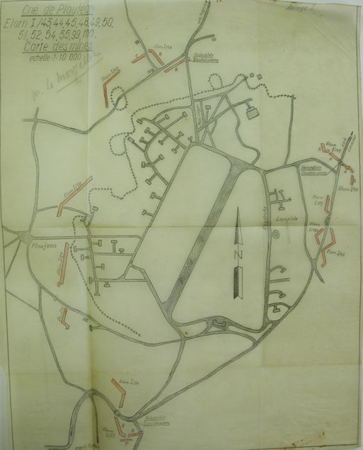 Plan de la base aérienne de Morlaix-Ploujean, vers 1943-1944 (calque). En rouge, l'emplacement des champs de mines avec leur numérotation-