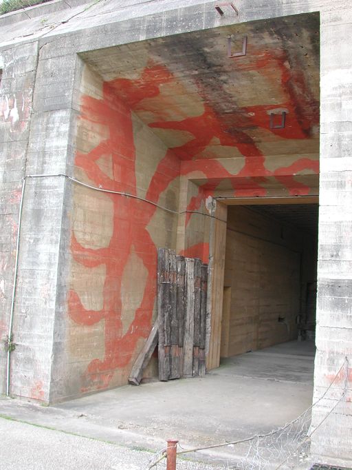 Vue de l'un des quatre garages : peinture camouflage ocre orangé d'origine (état en 2002)Immatriculation