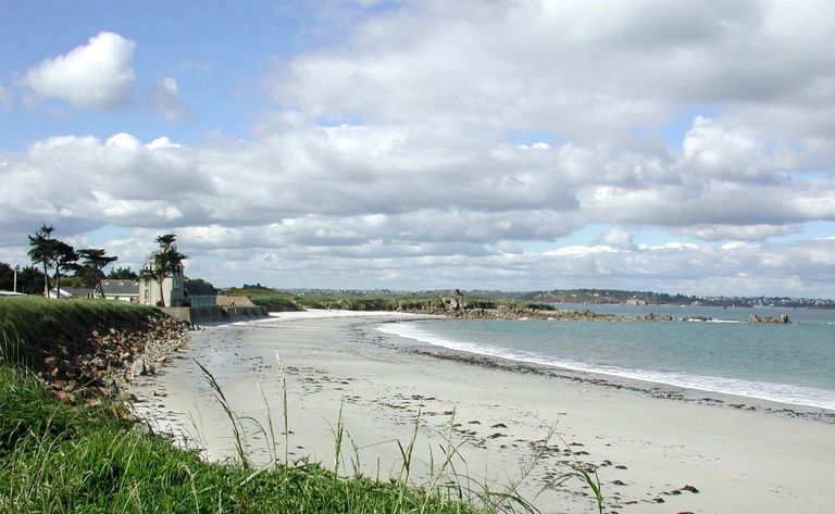 Vue générale de la plage de Saint-Samson depuis le nord-est. A droite, l'ancien Hôtel des Roches Jaunes. A l'arrière-plan, la pointe Saint-Samson et la casemate de type 680Immatriculation