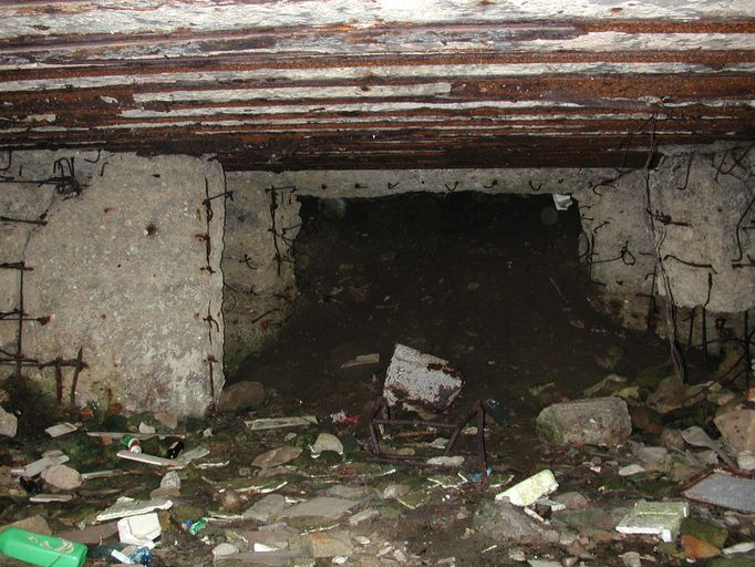 Vue de l'intérieur de la casemate de Beg Tanguy endommagée par le souffle d'une explosion durant le déminageImmatriculation
