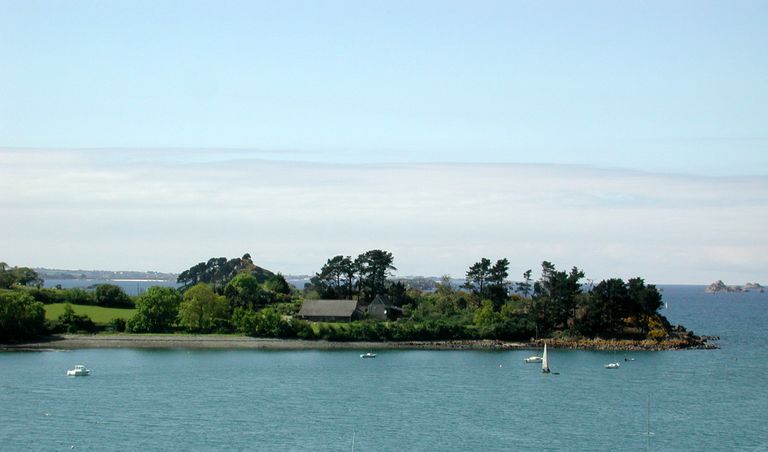 Vue générale de l'ensemble fortifié de Perrohen depuis Térénez (commune de Plougasnou), de ce côté, les arbres ont été épargnés par la tempêteImmatriculation