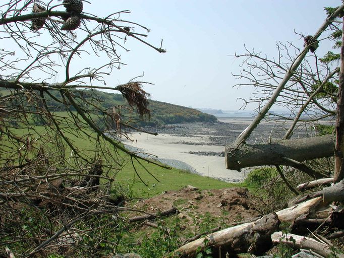Vue de la plage de Perrohan depuis le sommet de l'enceinte. L'éperon barré domine le rivageImmatriculation