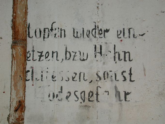 Vue de la peinture murale de la pièce de vie / chambre de troupe : marquage réglementaire pour l'usage du poêle de forteresse (état en 2002)Immatriculation