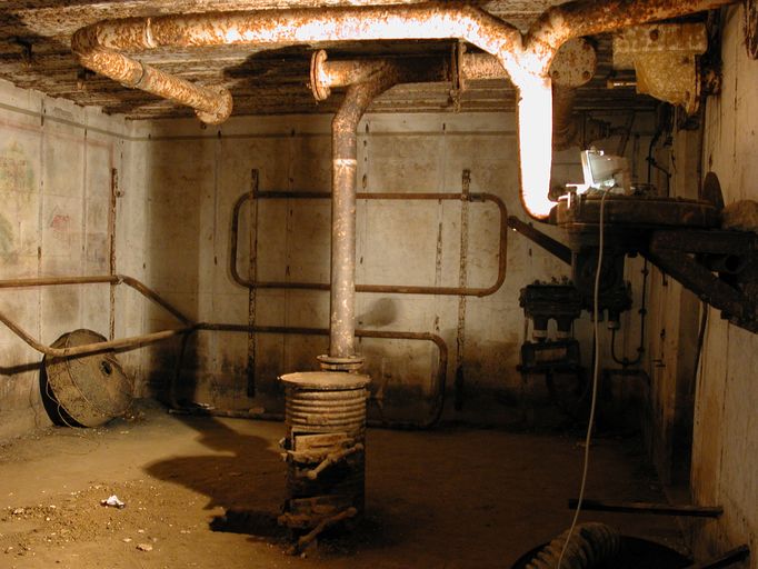Vue de la chambre de troupe droite : poêle, lits superposés, boitier de connexion téléphonique, système de ventilation...Immatriculation
