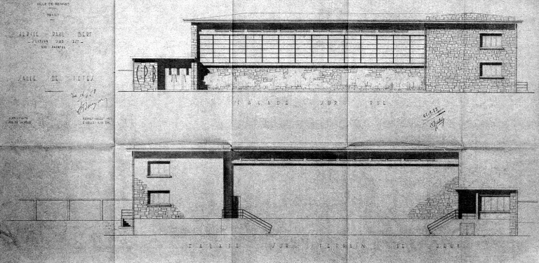 Cercle Paul-Bert. Salle des Fêtes. Elévations sur rue et sur le terrain de sport, 1953 (A. C. Rennes)Immatriculation
