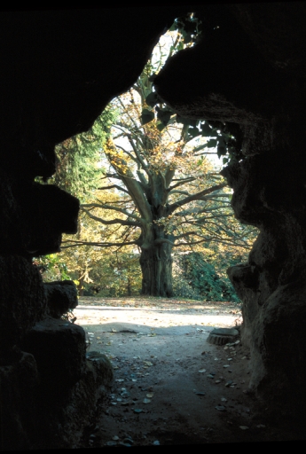 Grotte artificielle en béton sculpté façon bois, vue depuis l'intérieurImmatriculation