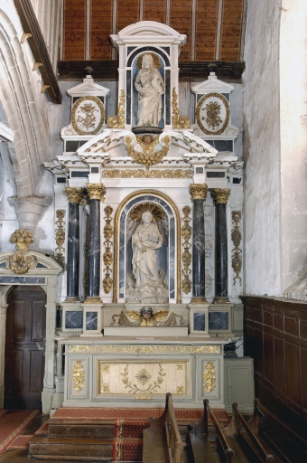 Ensemble de l'autel de saint Pierre (ancien autel de saint Sébastien) : autel, retable, gradin d'autel, 2 degrés d'autel,