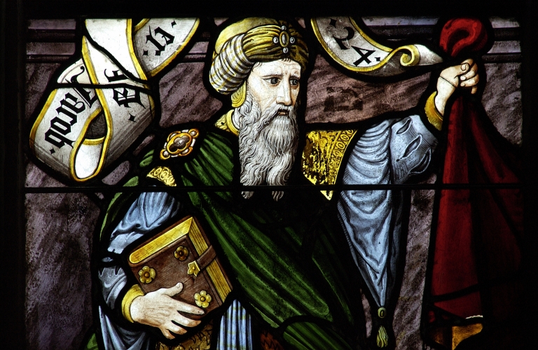 Lancette gauche (a3) : Personnage portant une citation de Moïse : Une étoile se lève de Jacob, un rameau sort d'IsraëlImmatriculation