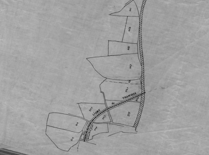 Extrait du cadastre, calque des voies de communication (début 20e siècle) ; bifurcation au nord du centre-bourgImmatriculation