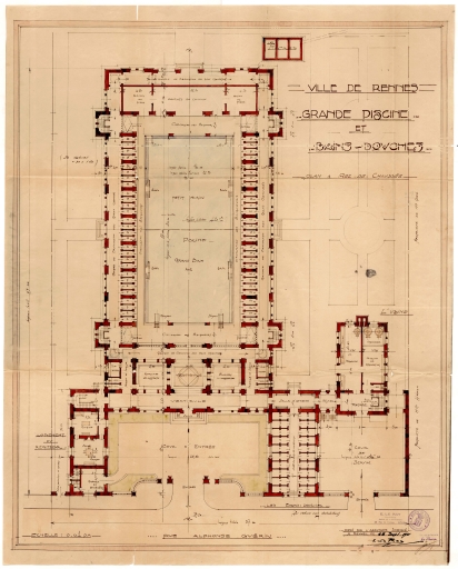 Grande piscine et bains-douches. Plan du rez-de-chaussée, E. Le Ray, 1921 (A. C. Rennes ; 2 Fi 2595)Immatriculation