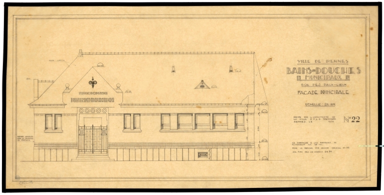 Bains-douches municipaux, rue des Paulieux. Façade principale, E. Le Ray, 1932. (A. C. Rennes ; 2 Fi 5983)Immatriculation
