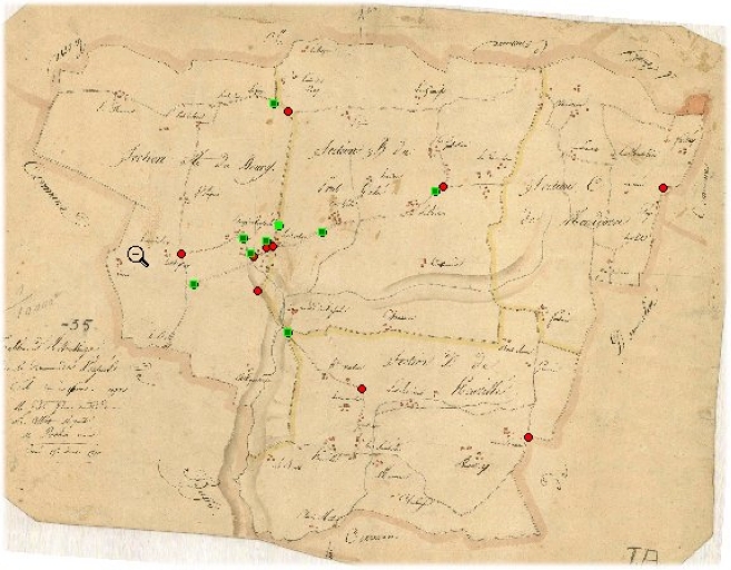 Les croix recensées -en vert- projetées sur le cadastre de 1810Immatriculation