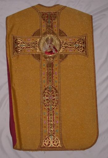 Ornement doré : chasuble, étole, manipule, voile de calice, chape,