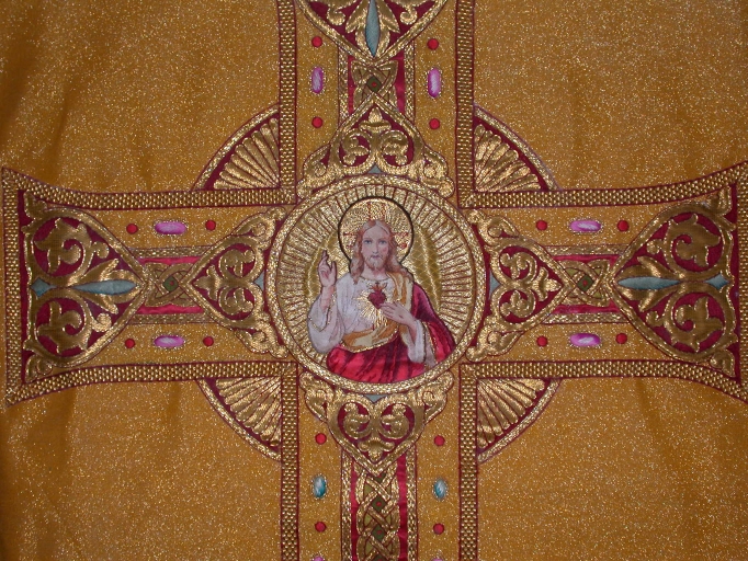 Ornement doré : chasuble, étole, manipule, voile de calice, chape,