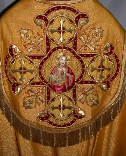 Ornement doré 1 : chape, chasuble, 2 dalmatiques, 4 étoles, manipule, voile de calice, bourse de corporal, voile huméral,