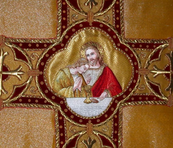 Ornement doré 1 : chape, chasuble, 2 dalmatiques, 4 étoles, manipule, voile de calice, bourse de corporal, voile huméral,