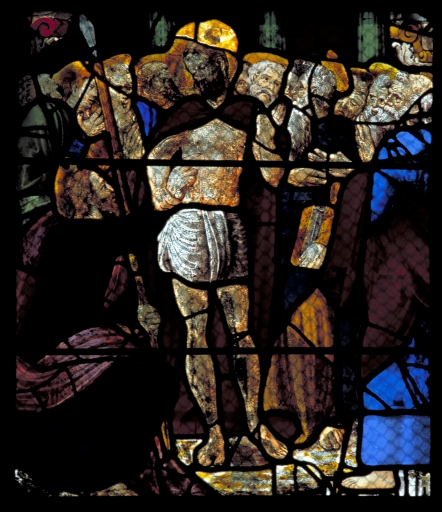 Verrière sud, troisième registre, panneau gauche : le Christ montrant ses plaies à Thomas.Immatriculation