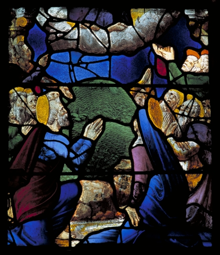 Verrière sud, troisième registre, panneau droit : l'Ascension.Immatriculation