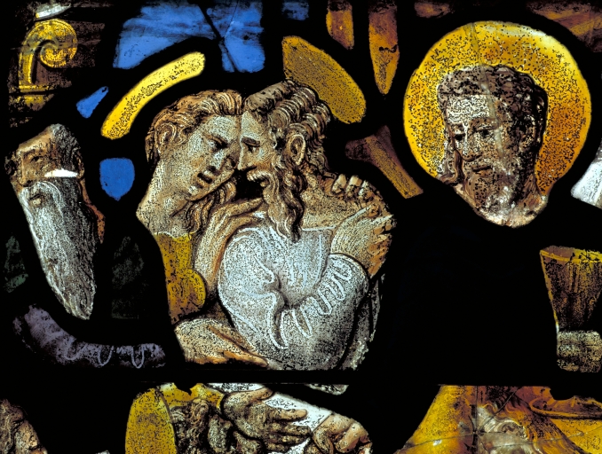 Verrière nord, détail 1er registre, panneau gauche : la Cène, détail, têtes du Christ et de saint Jean.Immatriculation