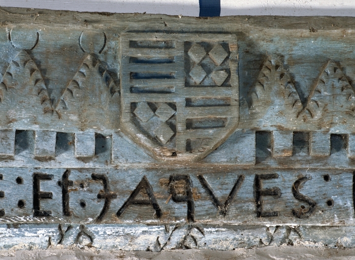 Sablière datant l'édifice, détail du blason des Martel en alliance avec Rimaison et Rohan.Immatriculation