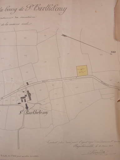 Plan des abords du bourg de Saint-Barthélemy indiquant les lieux destinés à l'établissement du cimetière, 1868 (A.D. du Morbihan, série O)Immatriculation