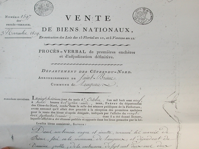 Procès-verbal de la vente d'un terrain Bien National sur le DPM (1809, mairie de Langueux)Immatriculation