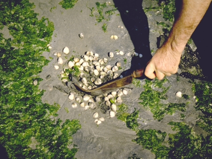 Geste pour couper la vase et ramasser les coques avec un coquéImmatriculation