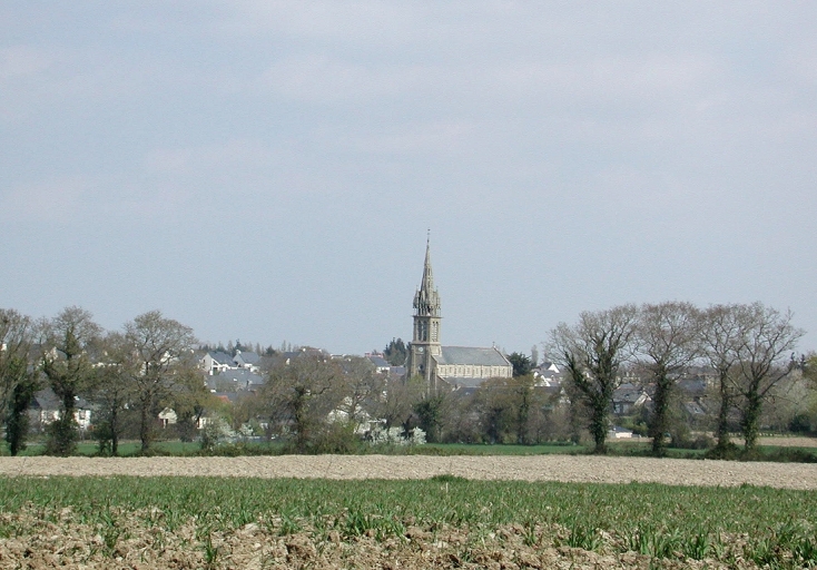 Planguenoual. Vue générale du Bourg dominé par l'église Saint-Pierre et Saint-Paul. Vue prise depuis la Petite-Ville-Hervé.Immatriculation