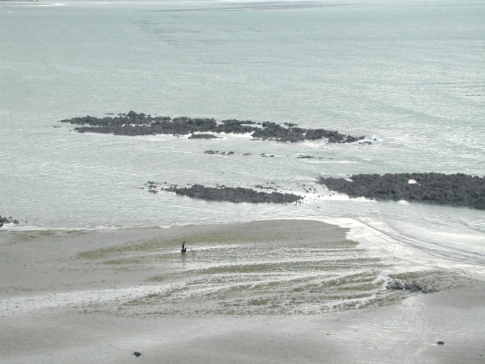 Vue générale d'une ancienne pêcherie : écluse ou parcs en pierres, rochers de Romel (la Cotentin)Immatriculation