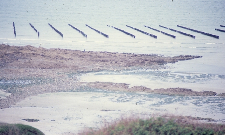 Vestiges de l'ancienne pêcherie Roemel devant le rocher Margaux en 1985 (la Cotentin)Immatriculation