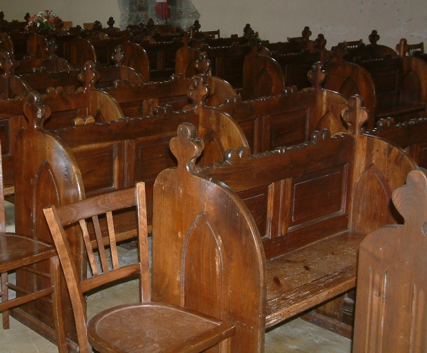 Ensemble du maître-autel, des retables latéraux, des statues et des bancs d'église,